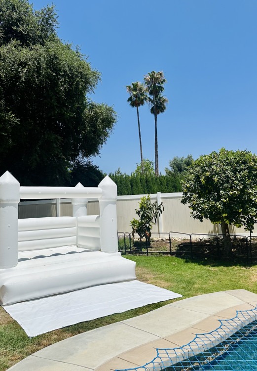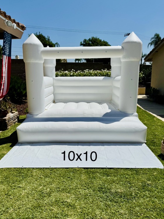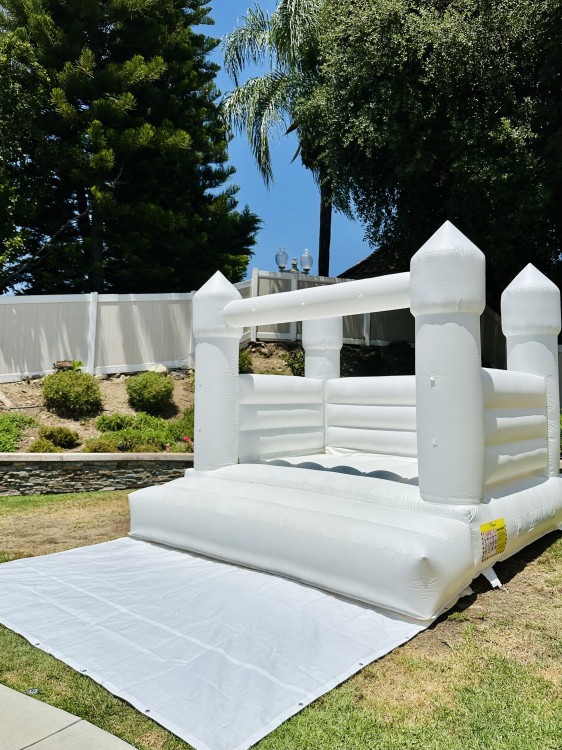 White Jumper — an all-white inflatable jumper with a roomy bounce surface, heavy-duty vinyl and mesh safety walls, plus quick setup and takedown; a clean, neutral choice for weddings, showers, and family parties.